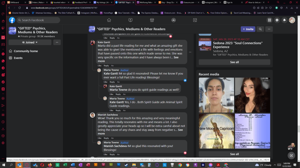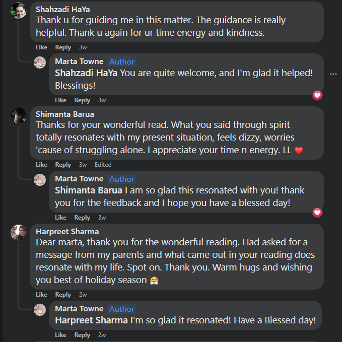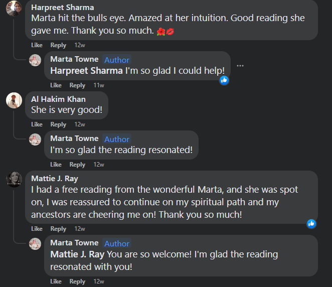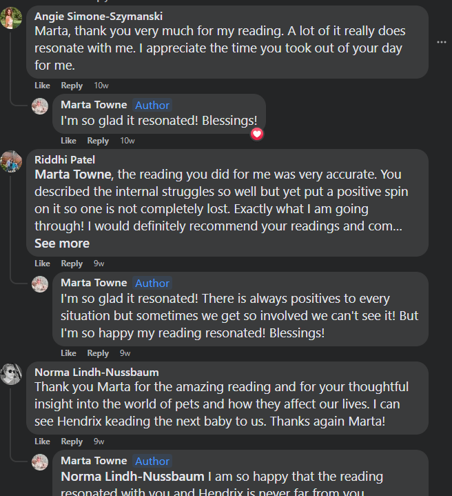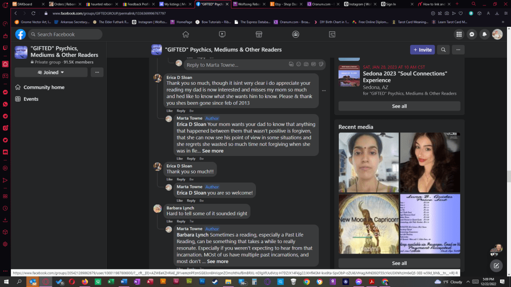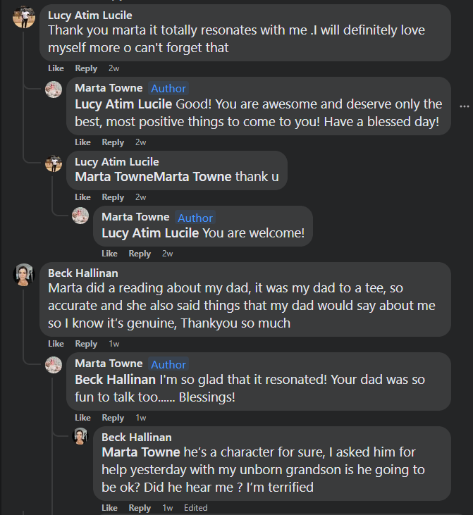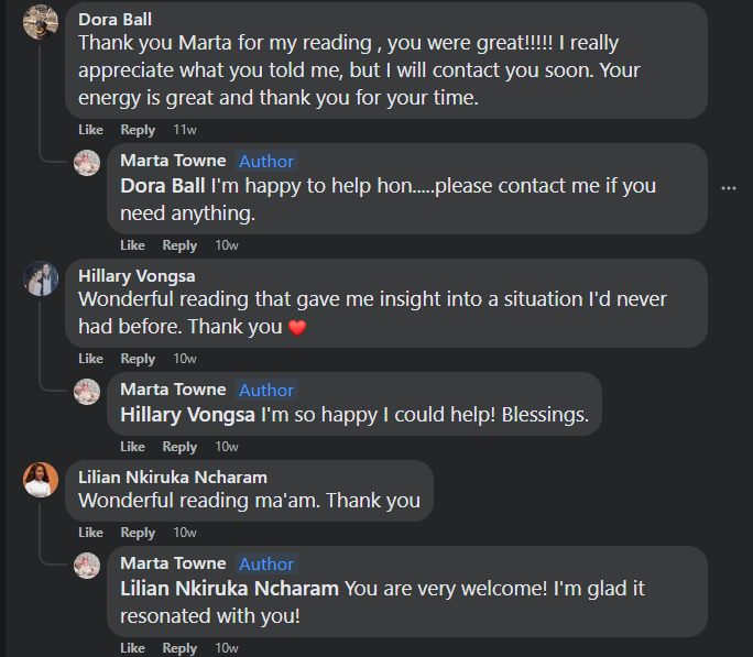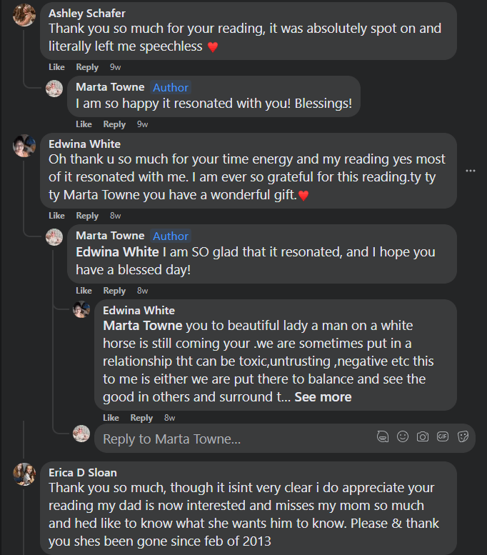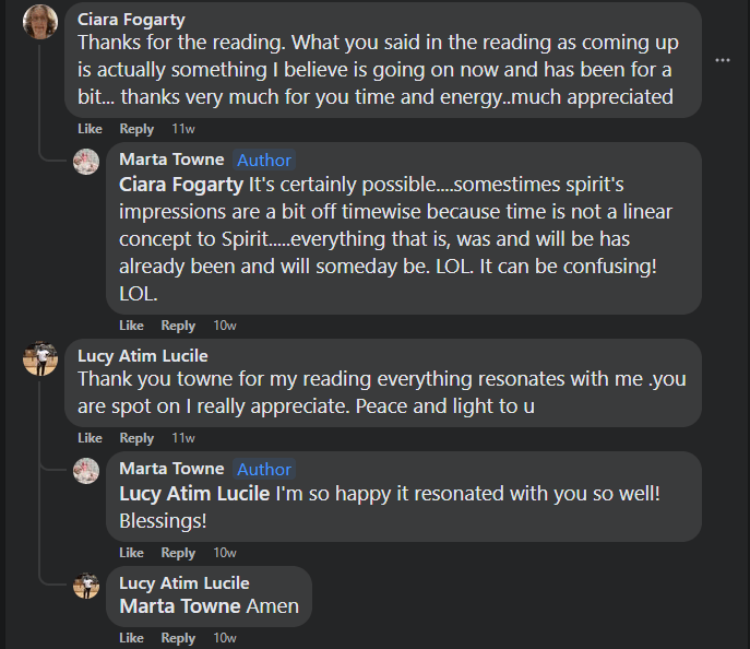 Feedback….. Concerned if we’re the “real deal”? I get that….so please take a look at these screenshots of our feedback…… If you’re intersted in joining the public groups we use to give readings and reach out to people, just message me!
