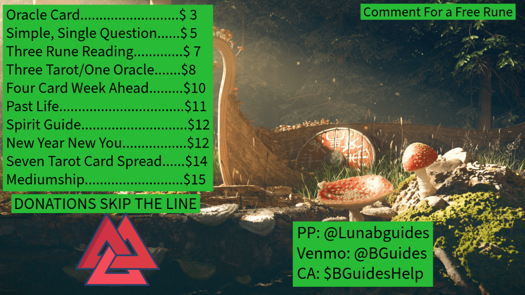 Five days a week we go LIVE somewhere on the internet. Our Facebook Profile is located at http://www.facebook.com/LunaLynBGuides , and we are live there on Mondays, Tuesdays, Thursdays and Fridays at 6pm CST, and 4pm CST on Thursdays. On Wednesday we go Live on the “Gifted” Psychics, Mediums and other Readers Facebook group at 4pm CST and on Gray Witch Tarot Facebook group at 6pm CST.