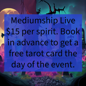 If you would like us to make a heartfelt attempt to reach out to a specific spirit, please message Luna at LunaBGuides@Gmail.com or PM us on Messanger so we can get things started. The cost is Per spirit, so if you want to hear from your grandma, dad and cousin, that is three donations. The cost is $15 per person/per spirit/per event. IF you pay in advance, you will receive a Tarot Card the Day of the Event . This is to make it easier by having as much of the “leg work” done before the event as possible. IF you want to have us seek out a specific spirit for ALL THREE EVENTS, the cost is $30. If you only want to be at one event, please tell us which event you wish to attend.